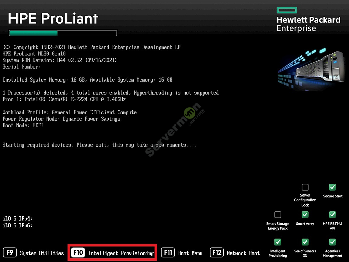 * 주의사항 : 위 화면이 켜진 후 15초간 동작이 없으면 'Intelligent Provisioning'메뉴로 자동 진입하게 됩니다.