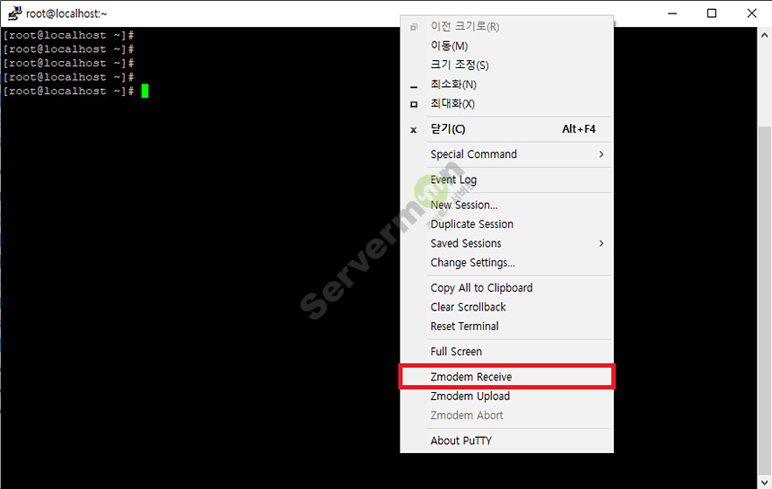 Zmodem Receive 기능과 Zmodem Upload 기능을 사용할 수 있습니다.
