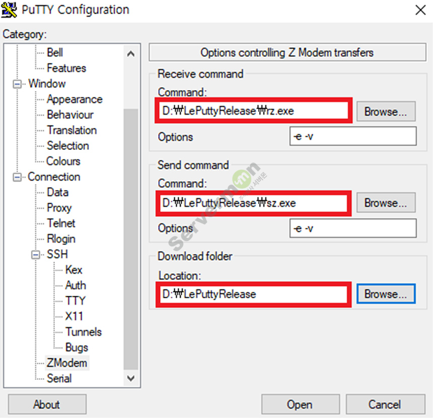 # putty를 실행하여 zmodem 설정에서 rz.exe 파일과 sz.exe 파일의 실행경로 및 다운로드 폴더를 설정합니다.