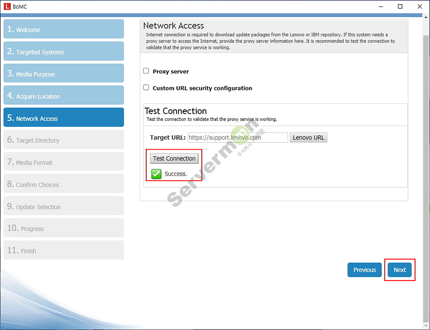 'Test Connection' 을 클릭 하면 업데이트 서버와 연결 테스트를 진행하며, 연결이 완료 되면 'success'가 표시 됩니다.