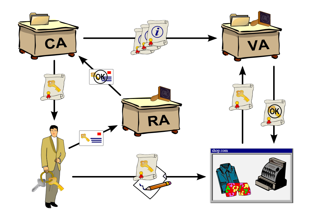 기본적으로 인터넷과 같이 안전이 보장되지 않은 공중망에서, 사용자들이 신뢰할 수 있는 기관에서 부여된 한 쌍의 공개키와 개인키를 사용하여 안전하게 데이터 및 자금을 교환하기위해 사용합니다.