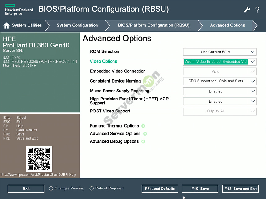 F9 키로 bios 진입 - System Configuration - Bios/Platform Config - Advanced Option - Video Connection ( Both -> Add-in) 으로 변경