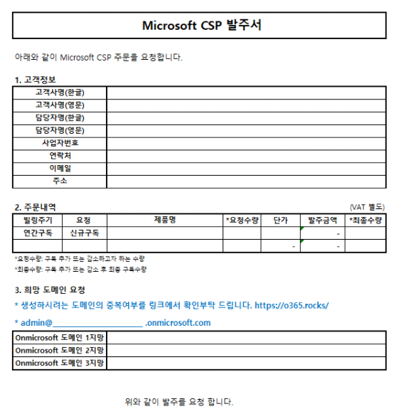 CSP 라이선스를 발주 하기 위해서는 하기와 같은 CSP 발주서가 필요 합니다.
