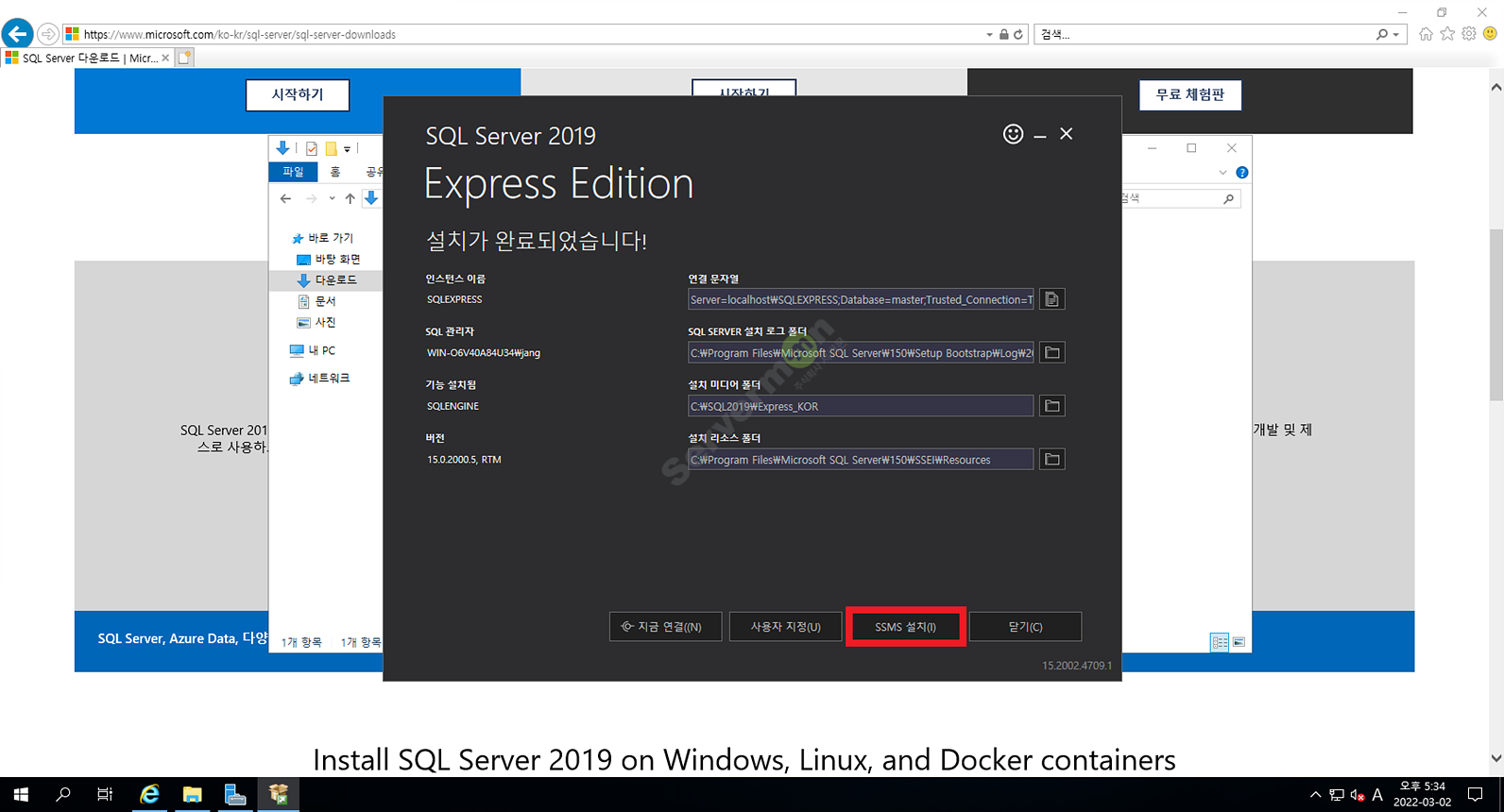 설치가 완료되었습니다. 설치정보를 확인 후 [SSMS 설치(I)]를 클릭하여 SSMS 설치를 진행합니다.