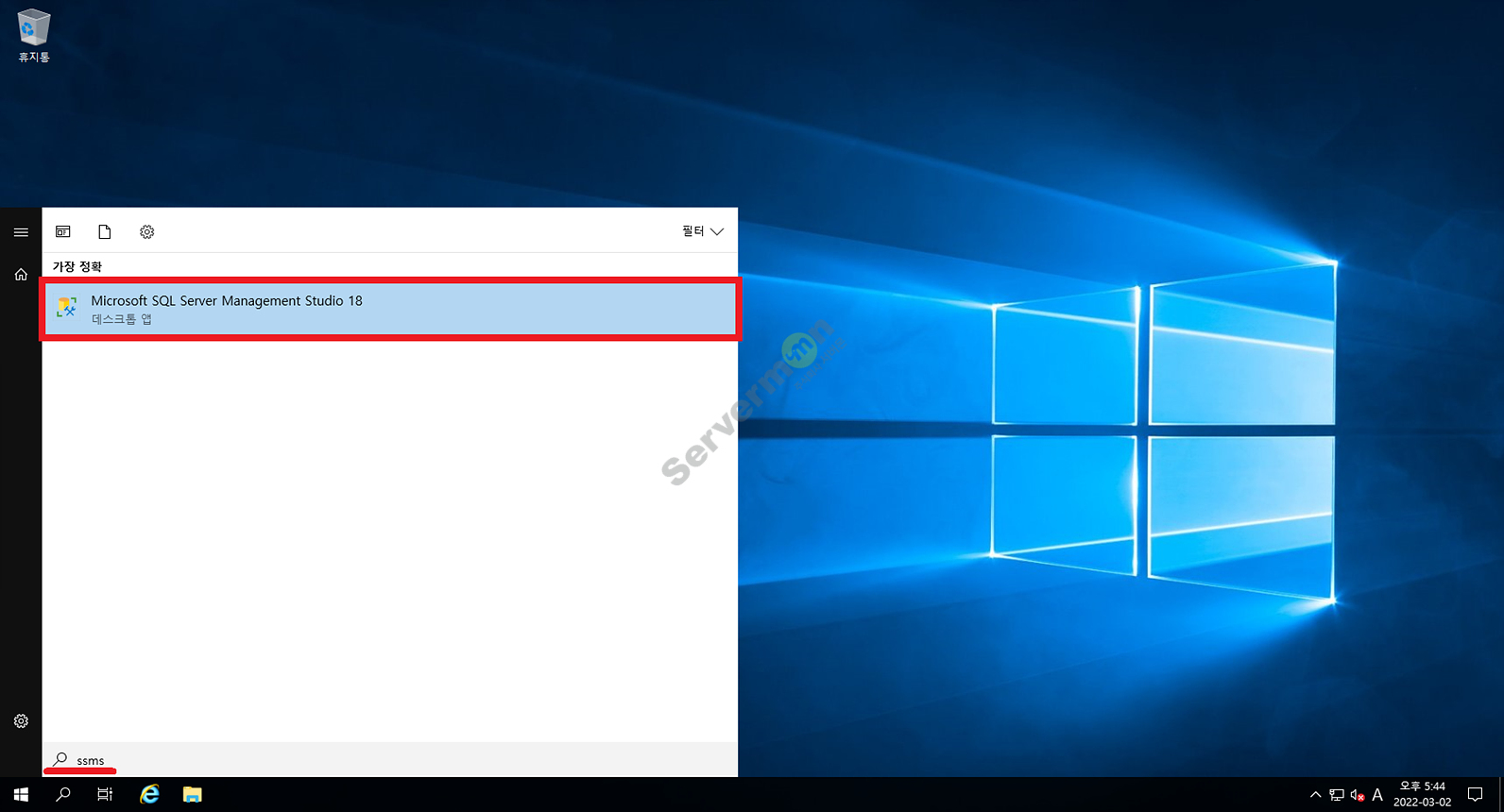 재부팅이 완료되면 윈도우 버튼을 클릭 후 'SSMS'를 검색하여 실행합니다.