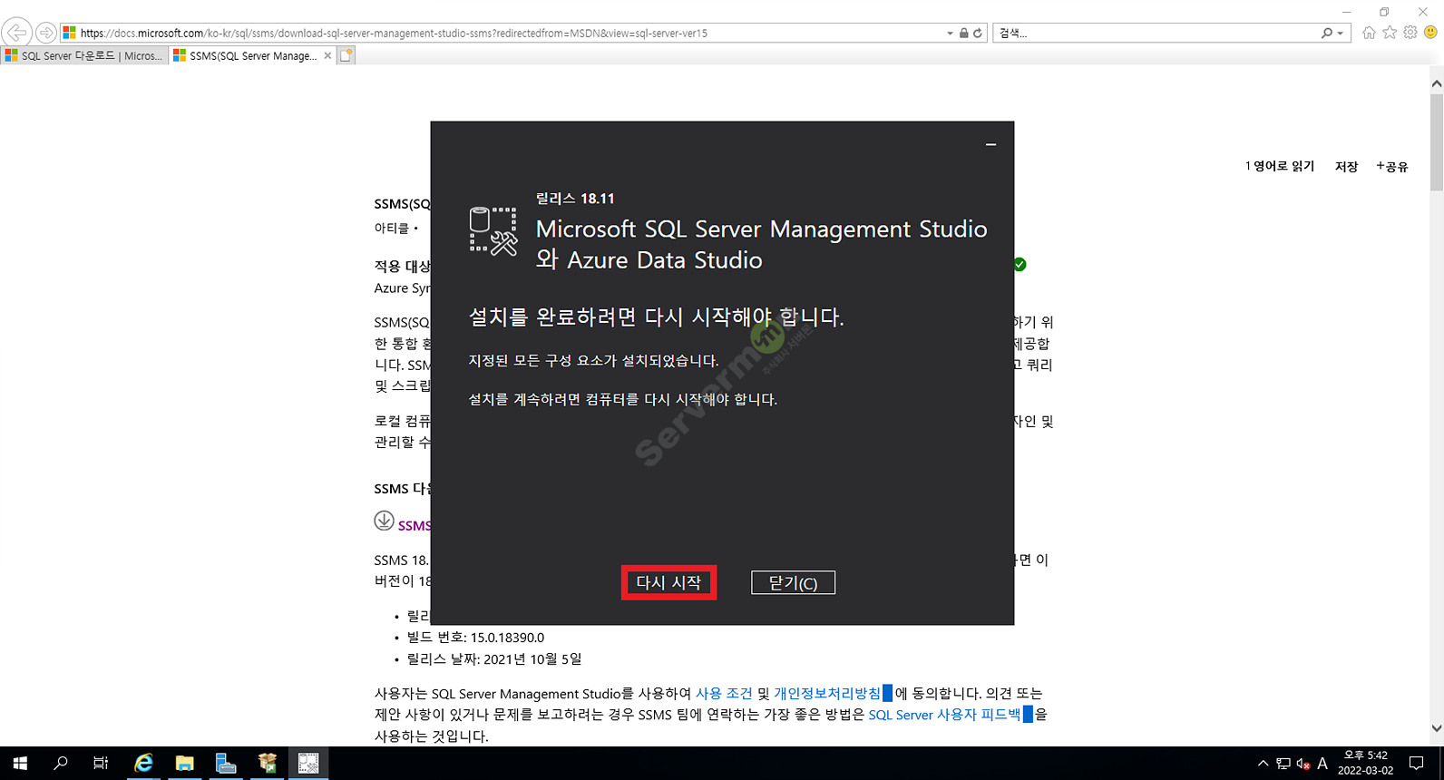 설치가 완료되면 [다시 시작]을 클릭하여 장비를 재부팅합니다.