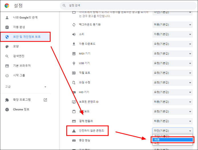3. "보안 및 개인정보 보호" - "안전하지 않은 콘텐츠" - "허용" 으로 변경