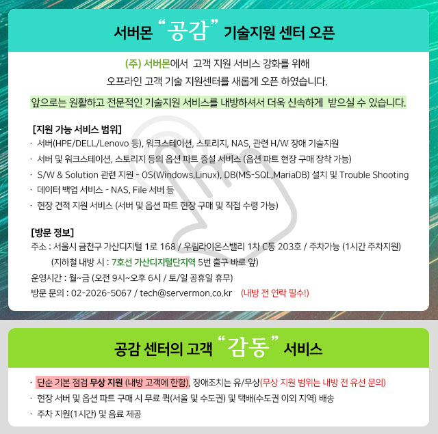 방문 예약 문의 : 02-2026-5067 / tech@servermon.co.kr (사전 방문 예약 필수)