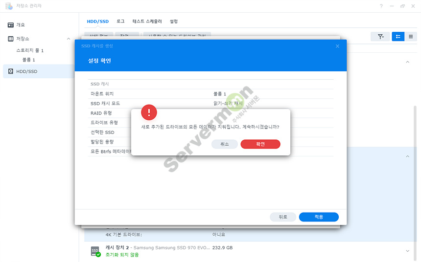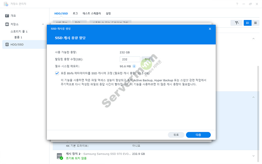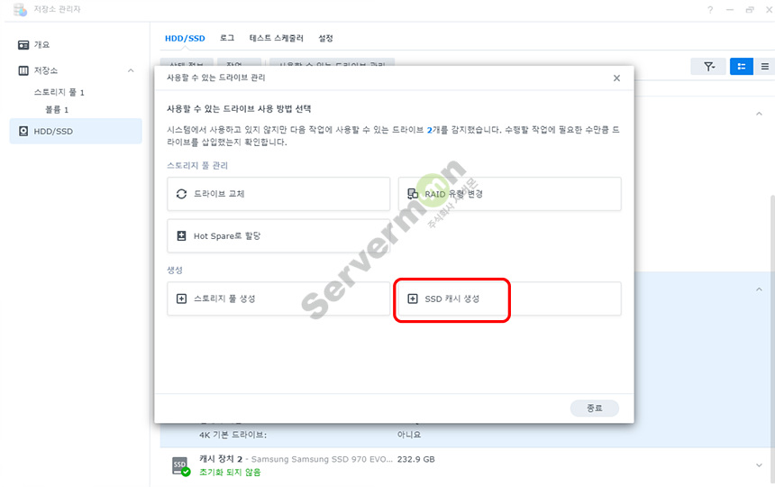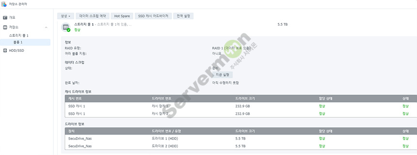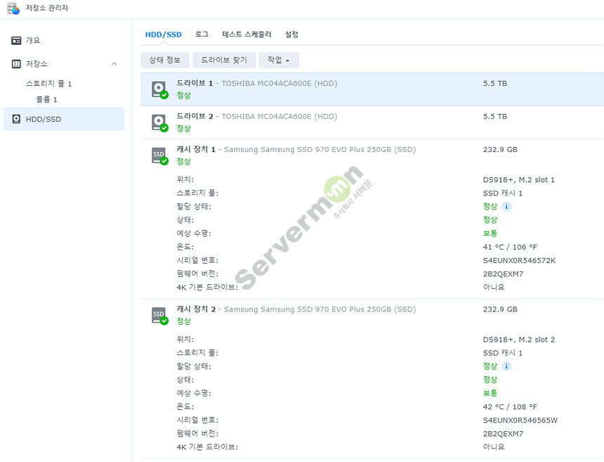 이상으로 Synology DS918+ 장비에 NVMe M.2 SSD 장착 및 캐쉬 설정 방법에 대하여 마치도록 하겠습니다.