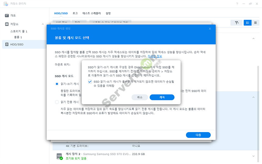 최소 2개 이상의 SSD를 장착하셔야 읽기/쓰기 캐시 설정을 할 수 있습니다.