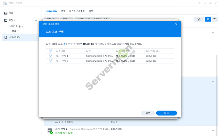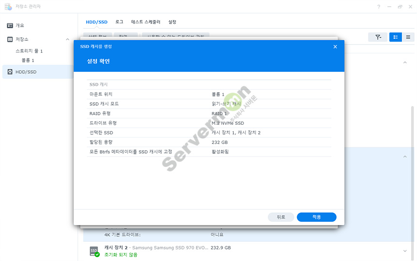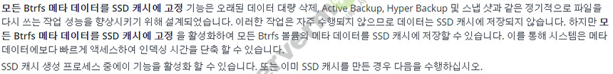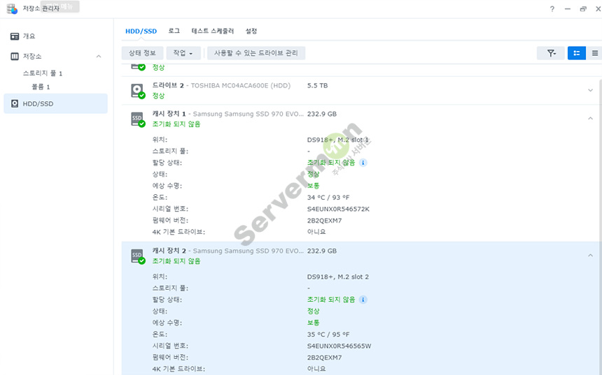 이상으로 Synology DS918+ 장비에 NVMe M.2 SSD 장착 및 캐쉬 설정 방법에 대하여 마치도록 하겠습니다.