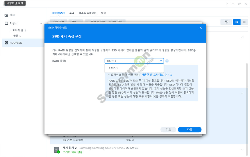 최소 2개 이상의 SSD를 장착하셔야 읽기/쓰기 캐시 설정을 할 수 있습니다.