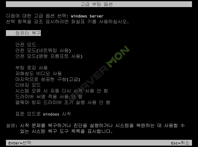 부팅이 불 가능한 경우에는 Windows Server 설치 CD를 넣고 컴퓨터 복구로 진입하여