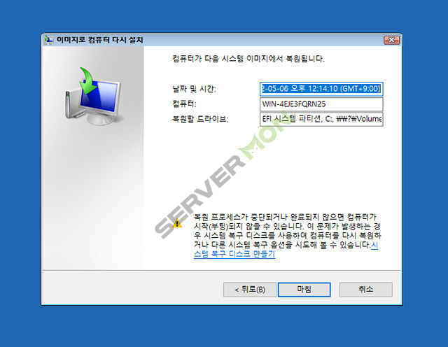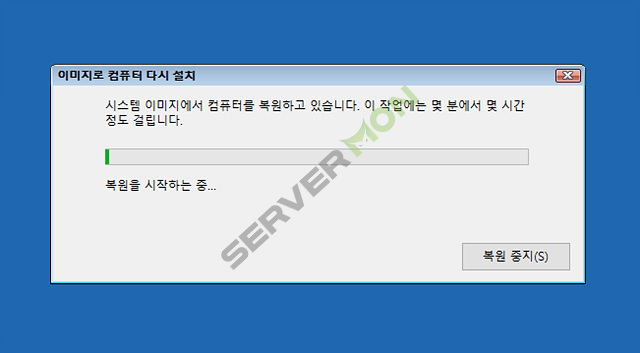 9. 복원이 진행되고 완료가 되면 자동으로 재 부팅되며 시스템이 재 시작 됩니다.