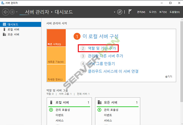 1. 서버 관리자에서 역할 및 기능 추가를 실행 시킵니다.