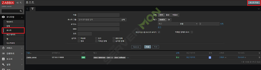 호스트 - 호스트 작성 메뉴로 이동하여 방금 등록한 Centos7를 등록 하도록 합니다.