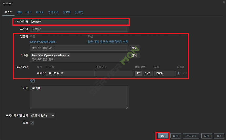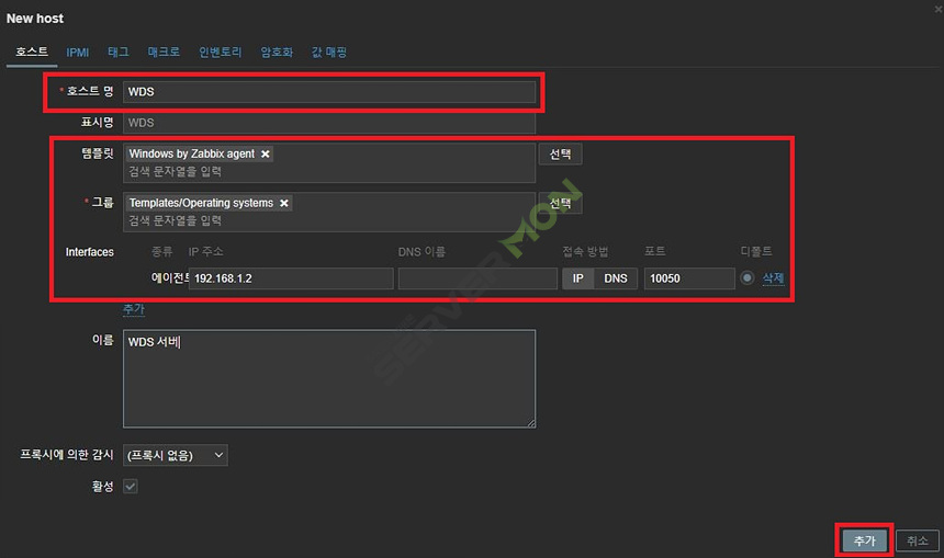 아래 사진처럼 호스트명, 템플릿, 인터페이스를 설정하도록 합니다.