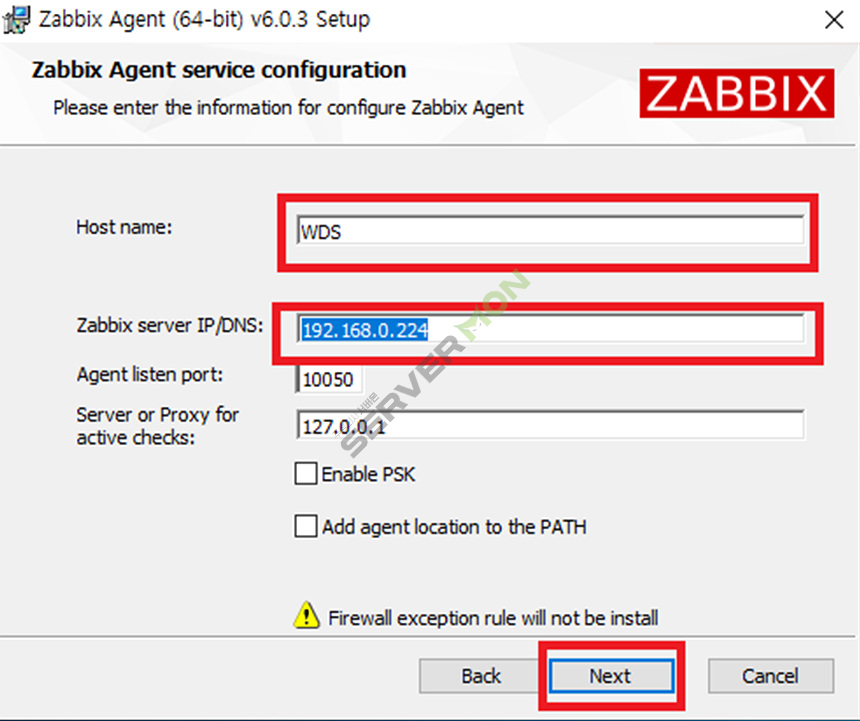 Zabbix server IP/DNS 는 이전 포스팅에서 구축한 서버의 IP 주소를 입력 합니다.
