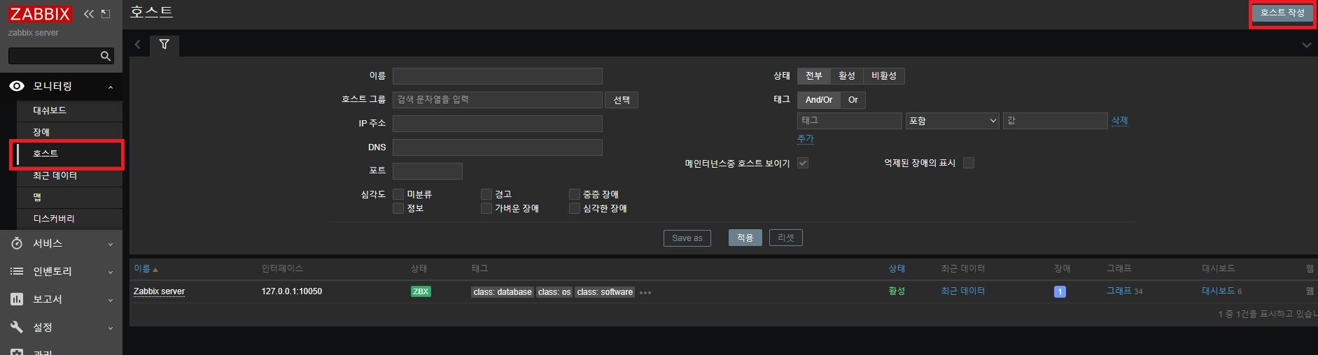 호스트 - 호스트 작성 메뉴로 이동하여 방금 등록한 Centos7를 등록 하도록 합니다.