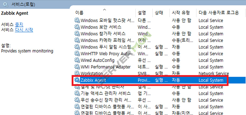 윈도우 서비스(services.msc) 를 확인하여 Zabbix Agent가 정상인지 확인 합니다.