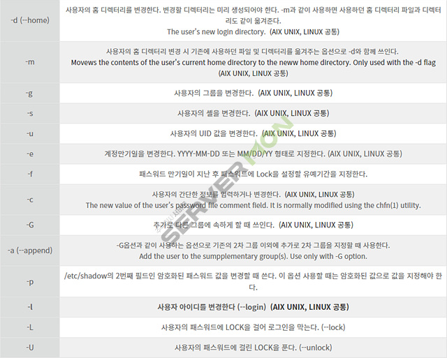 유저명을 변경시에서는 유저명, 홈디렉토리명을 변경하여야 하며