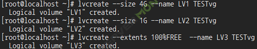 # lvcreate --extents 100%FREE --name LV3 TESTvg
