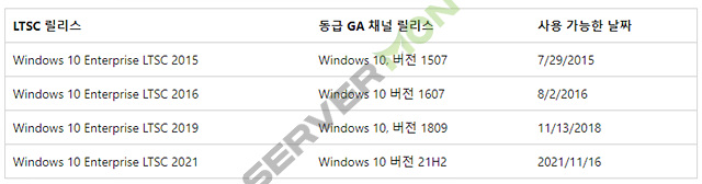 EnterPrise가 릴리즈 버전 들에 대해 약 18개월 가량만을 지원하는데 비해 LTSC 의 경우 릴리즈 된