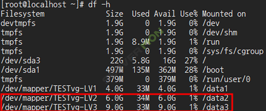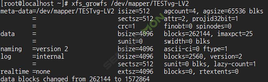 # xfs_growfs /dev/mapper/TESTvg-LV2