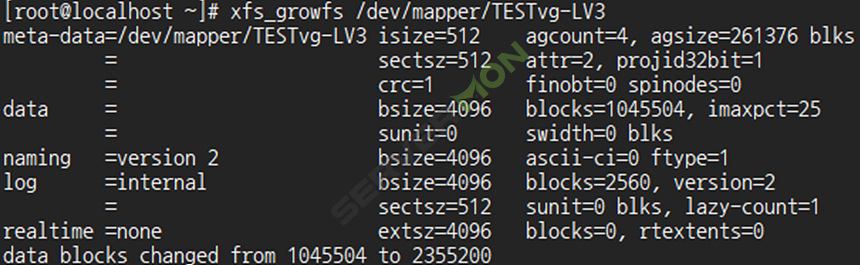 # xfs_growfs /dev/mapper/TESTvg-LV3