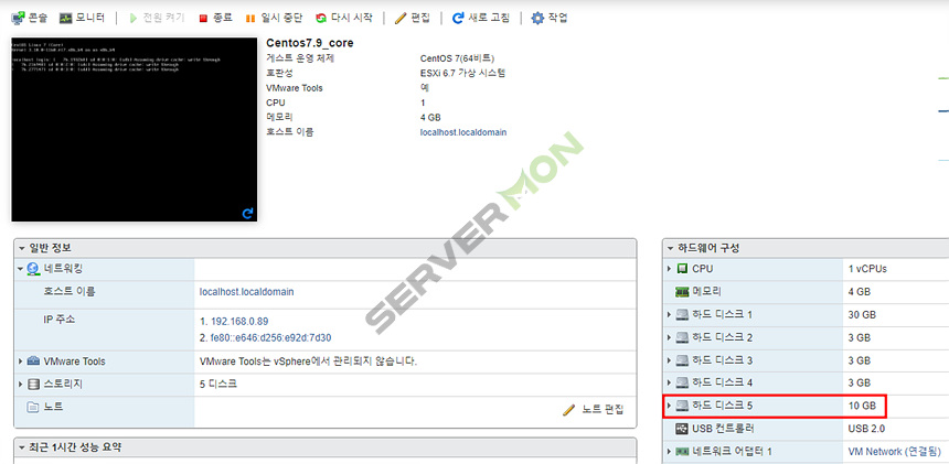 디스크 증설을 위해 VM 에서 10GB 짜리 디스크를 추가하였습니다.
