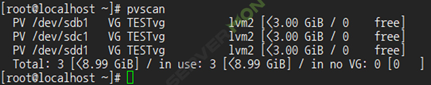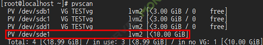 pvscan 에서는 아직 추가된 디스크가 보이지 않습니다.