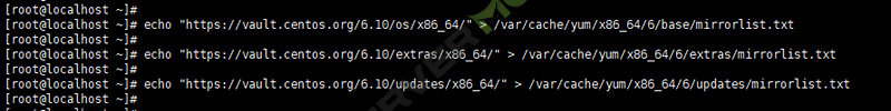 echo "https://vault.centos.org/6.10/updates/x86_64/" > /var/cache/yum/x86_64/6/updates/mirrorlist.txt
