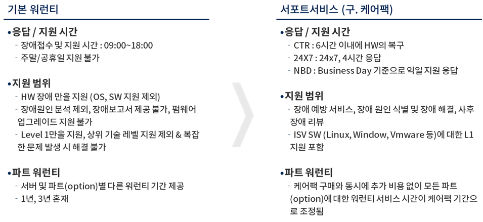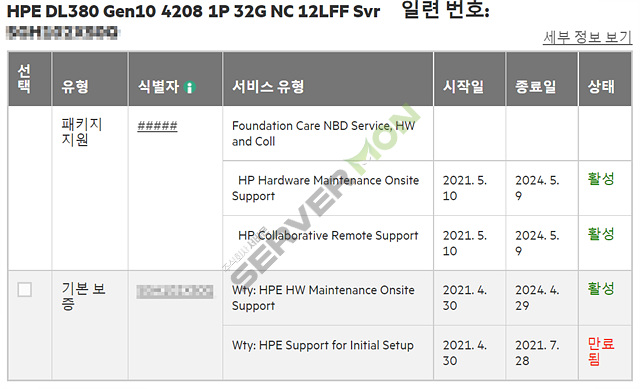 위 정보를 기준으로 "패키지 지원" 은 서비스 케어팩으로 NBD 가 적용된 것을 확인 할수 있으며