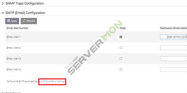 방금전 마친 Alert Configuration 메뉴의 Apply 버튼 아래 SMTP(Email) Configuration 항목이 보입니다. 이를 클릭 합니다.