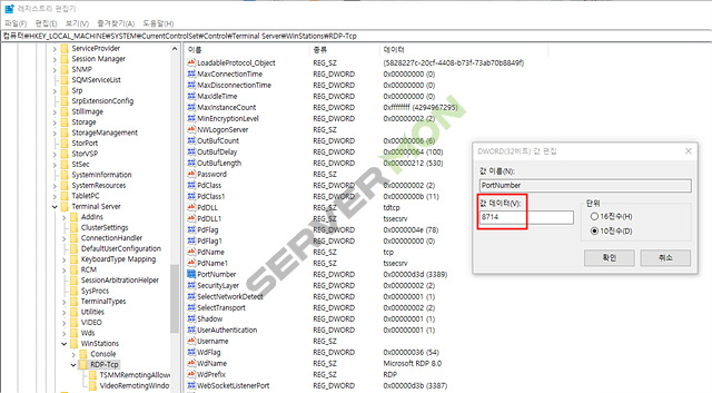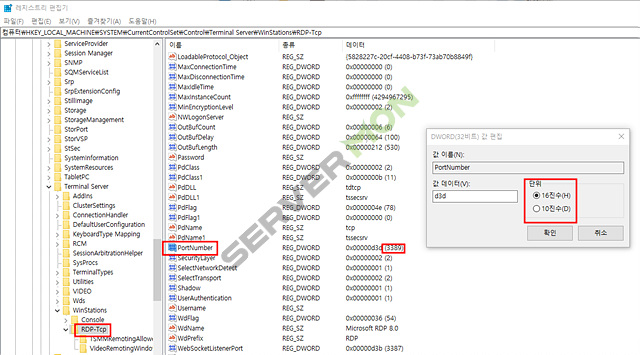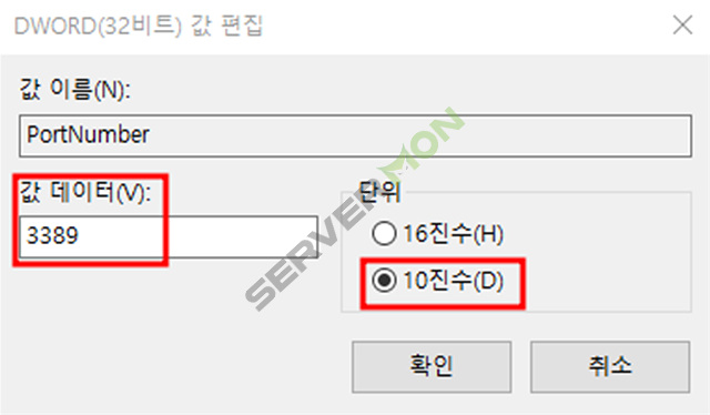 기존 3389 를 원하시는 포트로 변경 후 확인을 눌러주세요.