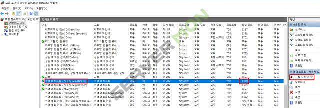 # 보안을 위해 기본포트[3389] 방화벽 규칙 사용 안 함 으로 변경