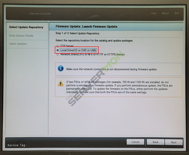 사진을 보시면 3가지 메뉴가 있는것을 확인할 수 있는데요. 이번시간에는 IODD 또는 DVD를 사용하여 SUU Firmware Update하는 과정이므로 2번째 항목인 Local Drive (CD or DVD or USB)를 선택하고 우측하단에 보이는 Next 버튼을 클릭합니다.
