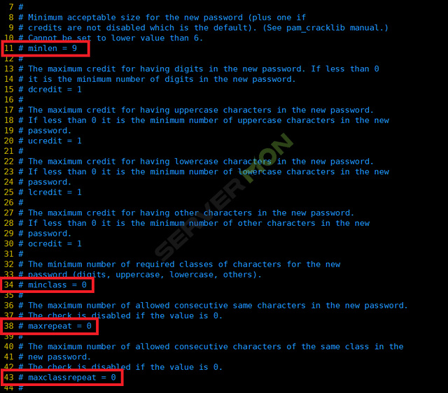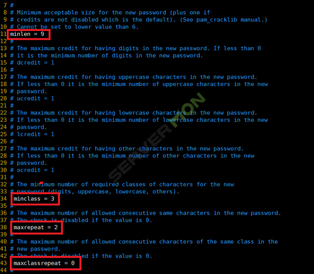- maxclassrepeat = 연속으로 같은 종류의 문자 사용 허용. 숫자, 영문자 등을 연속으로 사용하지 못하게 함.