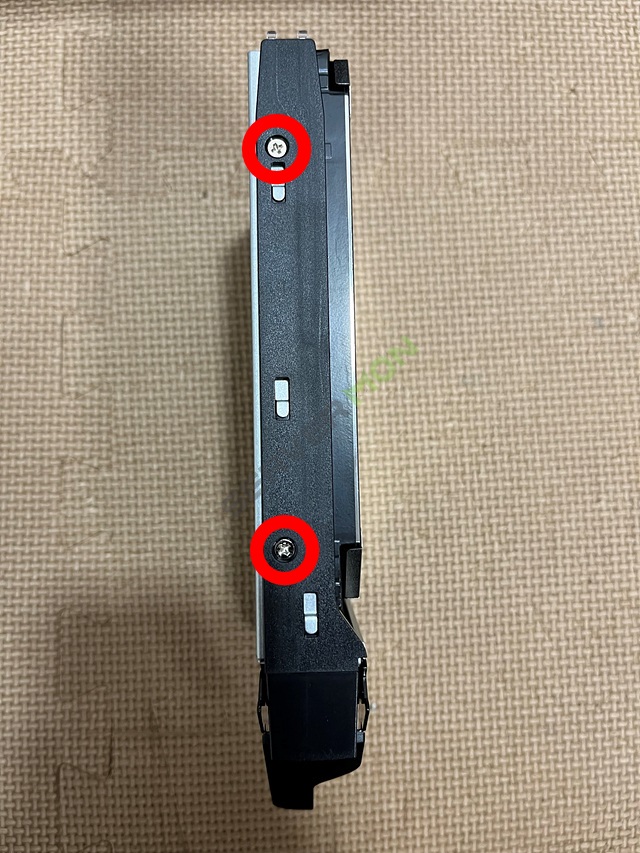 HDD의 SATA포트가 후면 하단에 위치하도록 가이드에 넣은 뒤 측면 나사구멍이 일치하는지 확인합니다.