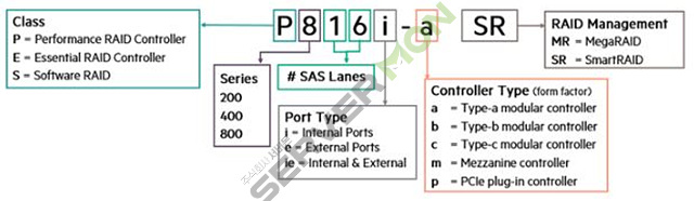 위 그림을 보면 Smart Array Controller의 네이밍 규칙을 알 수 있는데요, 맨 앞 알파벳은 소프트웨어RAID, E계열, P계열을 구분하는 자리이고 그 뒤에 이어지는 숫자는 200, 400, 800 시리즈를 나타내는 자리입니다.