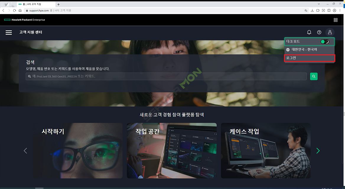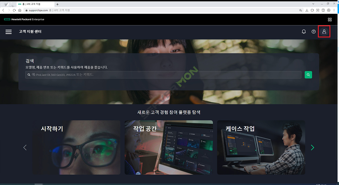HPE Support 홈페이지에 접속하고, 로그인을 위에 우측 상단의 사람모양 아이콘을 클릭합니다.