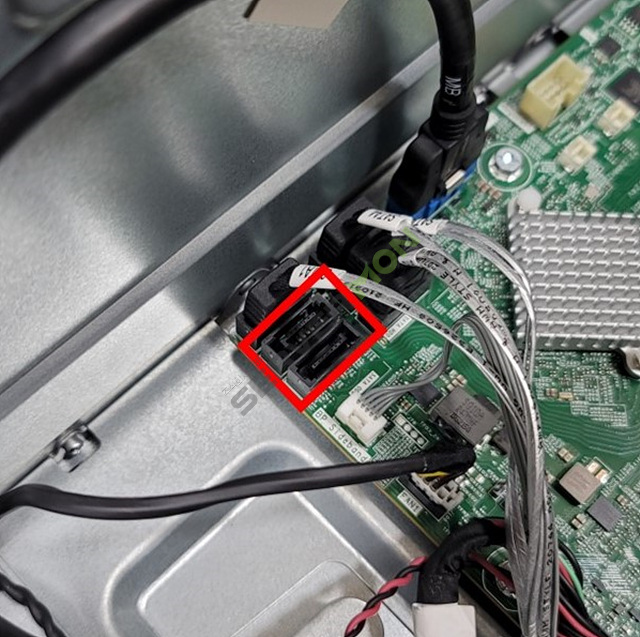 SATA&전원케이블 연결이 완료되면 위 사진과 같은 상태가 됩니다. 혹시라도 잘못 결합되었거나 케이블 분리가 필요한 경우 사진상 빨간네모로 표시된 부분을 누르고 케이블을 당겨서 제거해 주면 됩니다.