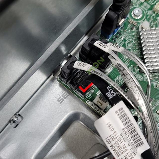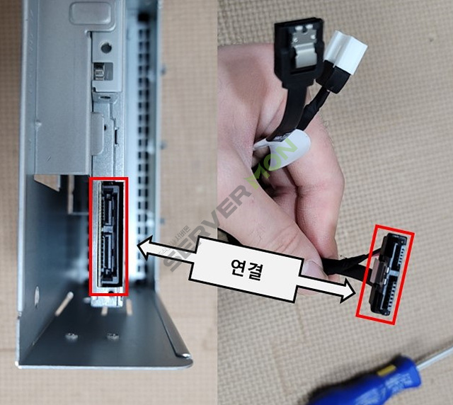 사진처럼 SATA케이블을 메인보드와 연결하고 서버 내 다른부품들과 간섭이 일어나지 않도록 케이블 정리를 해줍니다.
