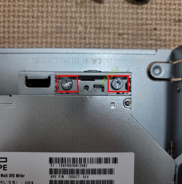 결합이 완료되면 위 사진과 같은 모습이 되는데 아직 ODD 고정용 나사를 조이지 않았기때문에 HPE 9.5mm SATA DVD-RW Jb Gen9 Kit이 앞뒤로 흔들거릴수 있습니다. 이때 빨간네모로 표시된 부분에 ODD 고정용 나사2개를 조여 HPE 9.5mm SATA DVD-RW Jb Gen9 Kit 을 움직이지 않게 해줍니다.