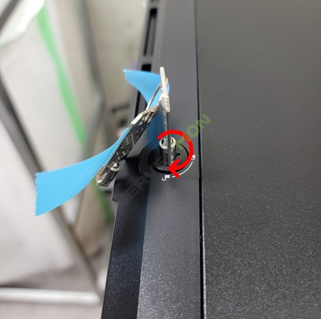 이제 열쇠로 전면부패널을 열어줍니다. 전면부패널의 왼쪽측면을 보면 열쇠구멍을 찾을 수 있는데 이곳에 열쇠를 끼워 돌려주면 됩니다.