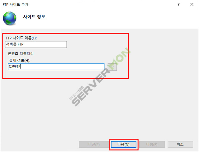 FTP 사이트 이름 및 서버가 될 드라이브 및 디렉토리 지정 후 다음.