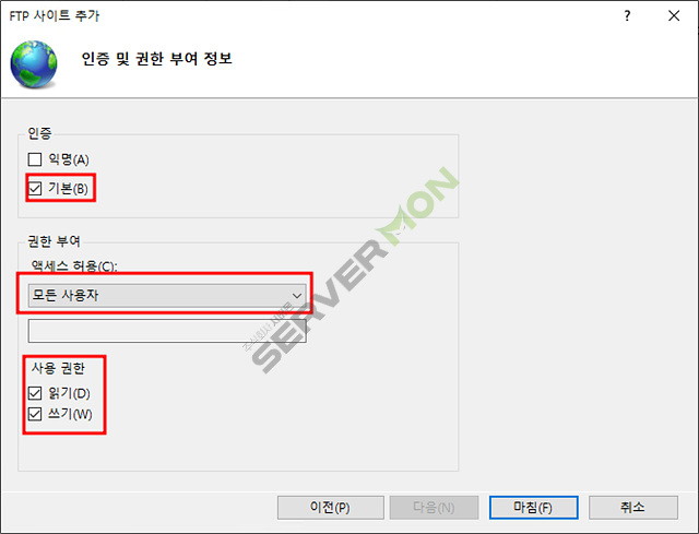 FTP 사이트 이름 및 서버가 될 드라이브 및 디렉토리 지정 후 다음.