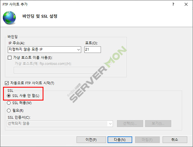 SSL인증서도 없기 때문에 사용안함으로 선택 합니다.