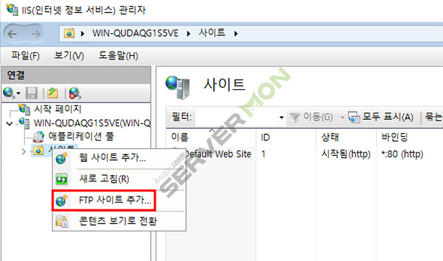 사이트 에서 마우스 우클릭 후 FTP 사이트 추가 클릭