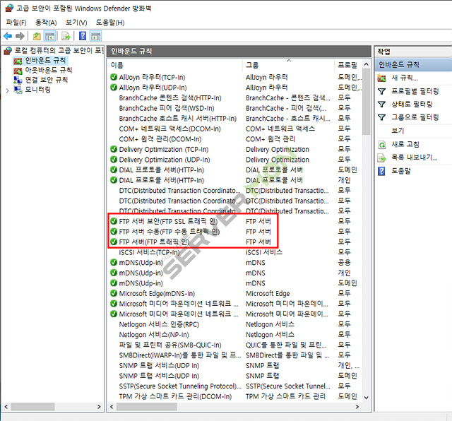 방화벽 인바운드 규칙 에서 FTP 서버관련 3가지를 다시한번 사용으로 변경 합니다.